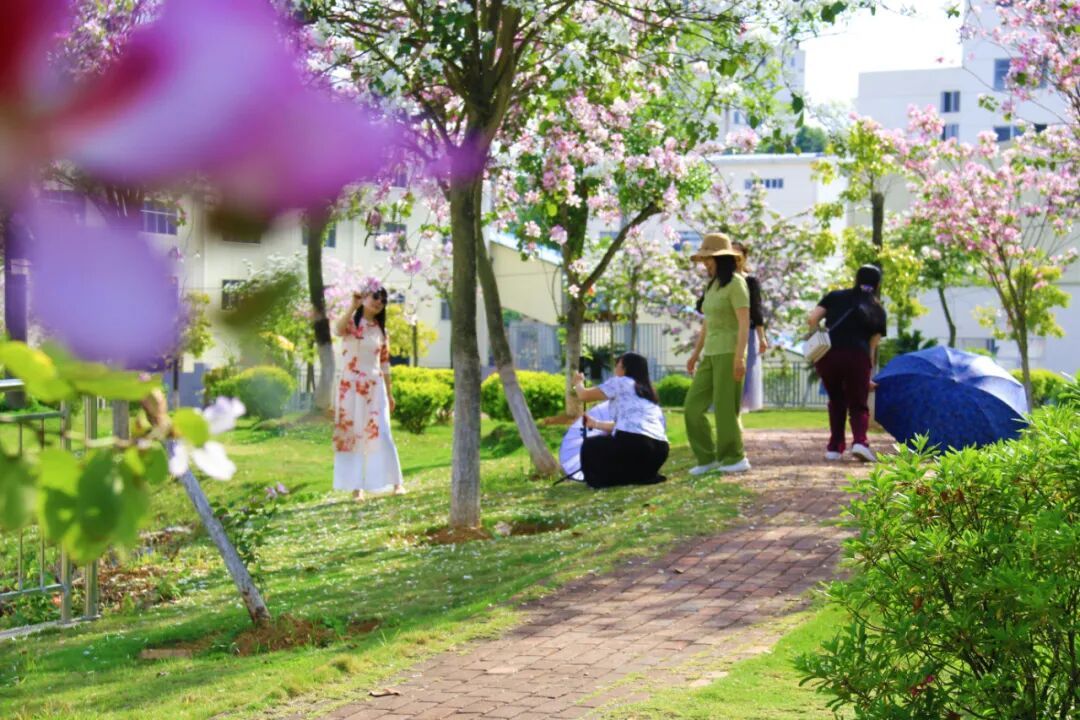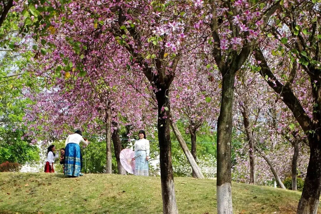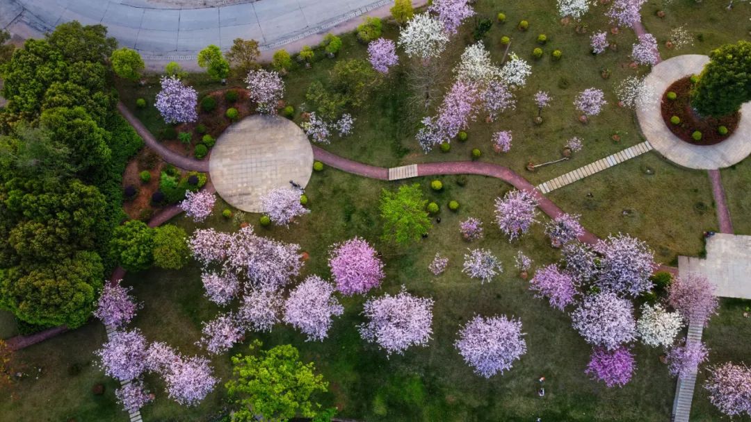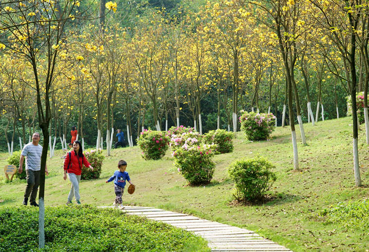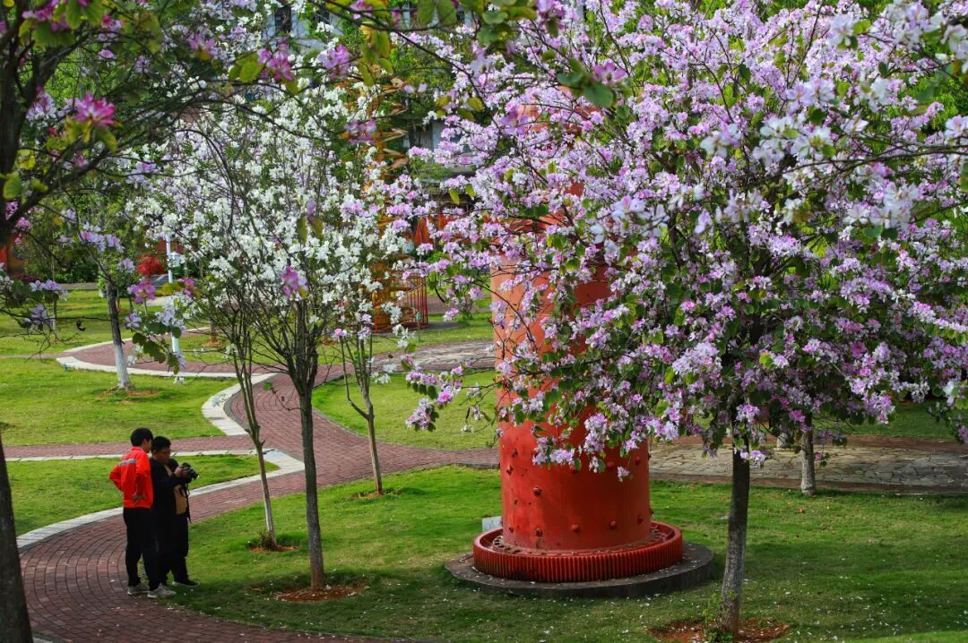 春天的矿山公园,是花的海洋:连片的宫粉紫荆洁白如雪、粉红如霞,金黄的风铃木灿烂夺目,与杜鹃花等交织成一条彩色锦带。