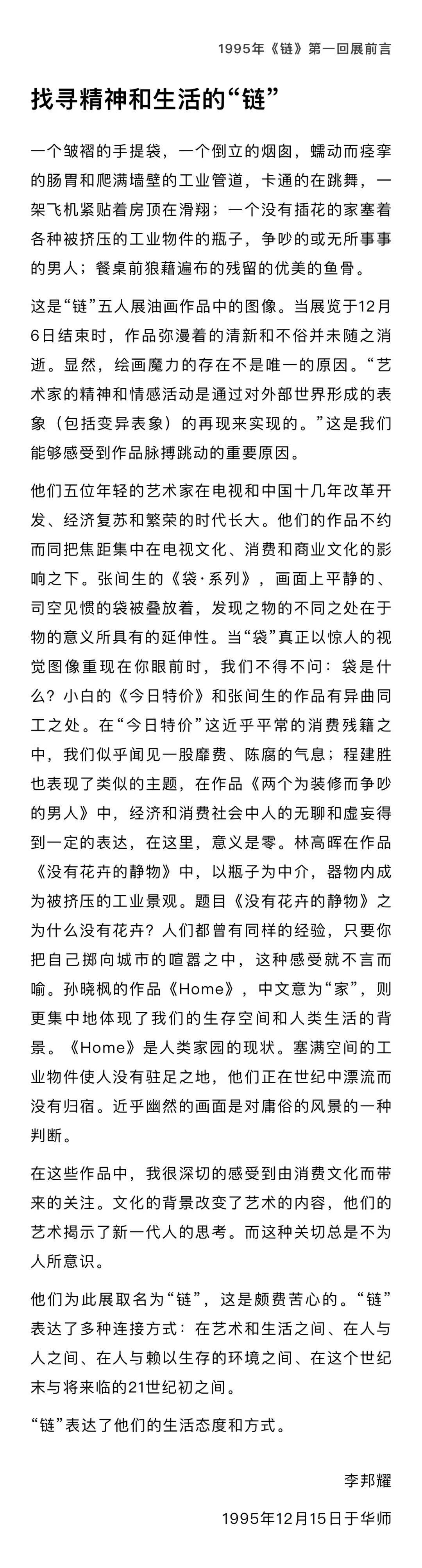 展览题目是李邦耀老师起的,前言也是由他操刀。他的身上,对学生有种的“舐犊之情”般的情感,他总是给予学生无限的包容、耐心和鼓励,对我们这一届,还有后来的江衡、柯济鹏、陈锦潮等学生,无不如是!“链”既是维系、脉络、逻辑,也是牵制,同时也包含着相互带动促进的意思。在学理和情感上皆立得住。今天的这个展览,是未知中的已知,也是已知中的未知!