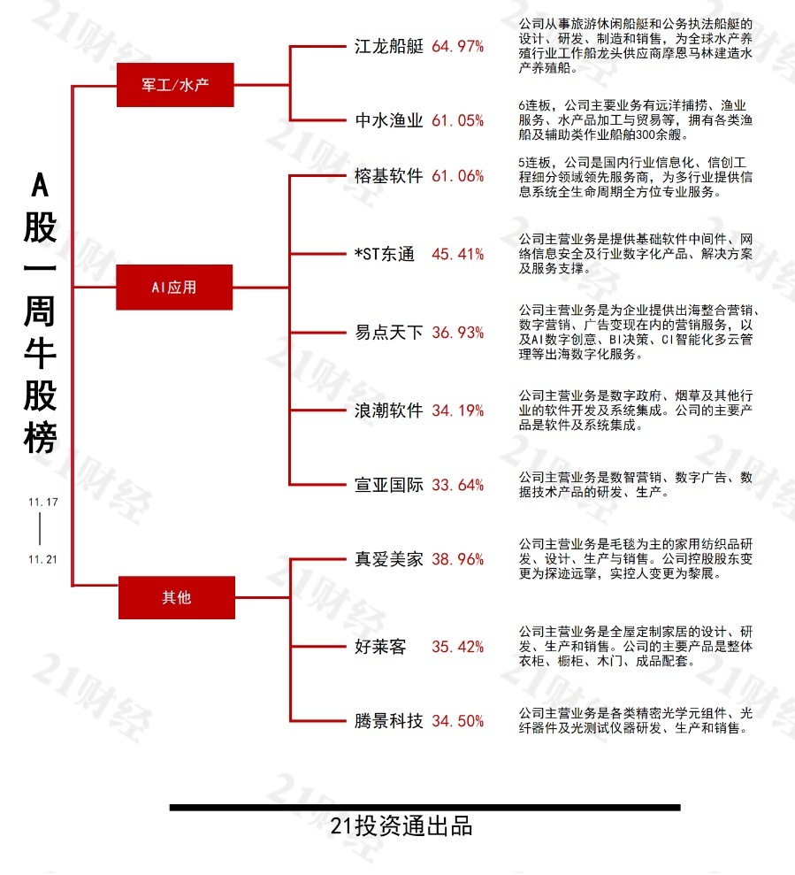 本期牛股榜中,江龙船艇(300589.SZ)以64.97%的周涨幅夺魁,榕基软件(002474.SZ)、中水渔业(000798.SZ)分别以61.06%、61.05%的涨幅位居第二、第三,*ST东通(300379.SZ)、真爱美家(003041.SZ)、易点天下(301171.SZ)、好莱客(603898.SH)周涨幅超35%。本期牛股榜十只个股过去一周累计涨幅均超过34%,其中多只个股涉及军工、水产或AI应用方向。