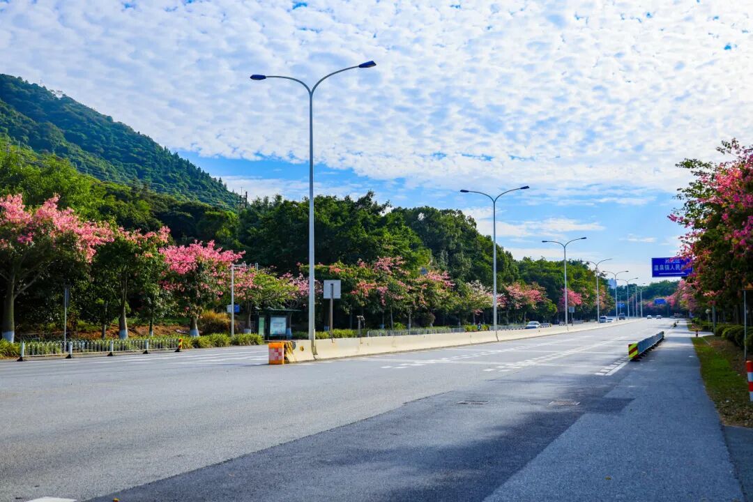 被誉为“广州最美公路”的国道105线温泉段,此刻是异木棉的主场!粉白相间的花瓣缀满枝头,随风飘落成“花瓣雨”,铺在路面、沾上衣角,宛如闯入日系治愈场景。远山如黛,花海绵延,随手一拍都是不用滤镜的大片,初冬的浪漫氛围感直接拉满~